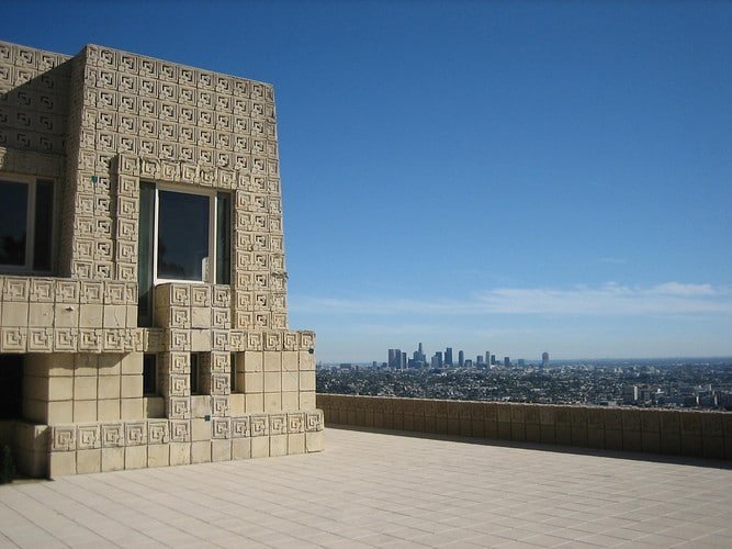 Designed by Louis Kahn, the Salk Institute is famous for its symmetric concrete structures that frame a view of the Pacific Ocean. It utilizes pozzolanic concrete which gives the building a warm, pinkish glow. It is considered a masterpiece of lighting, geometry, and functional design.